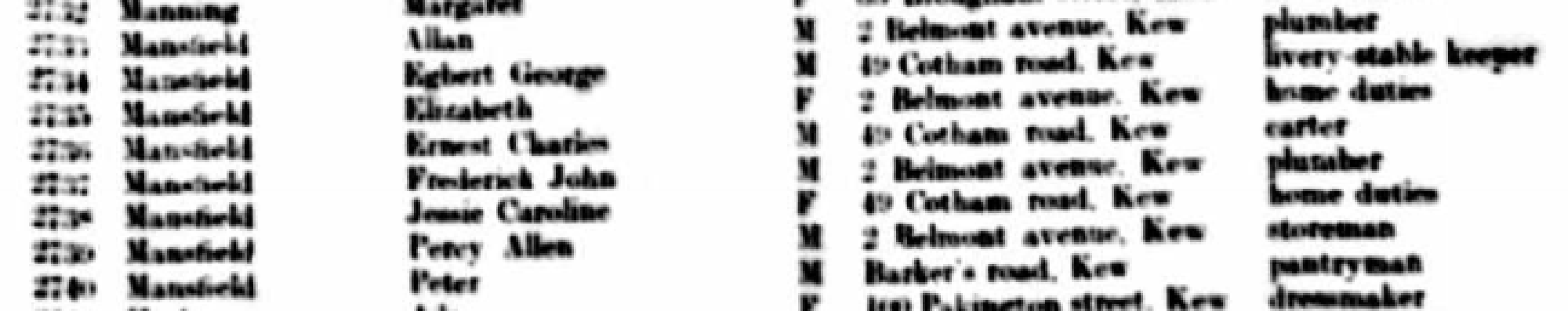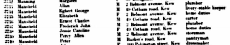 You can see the Mansfield's who lived in Kew on the list below - it also lists their jobs. Ernest Charles was living with his Mum and Egbert (26 year old brother).