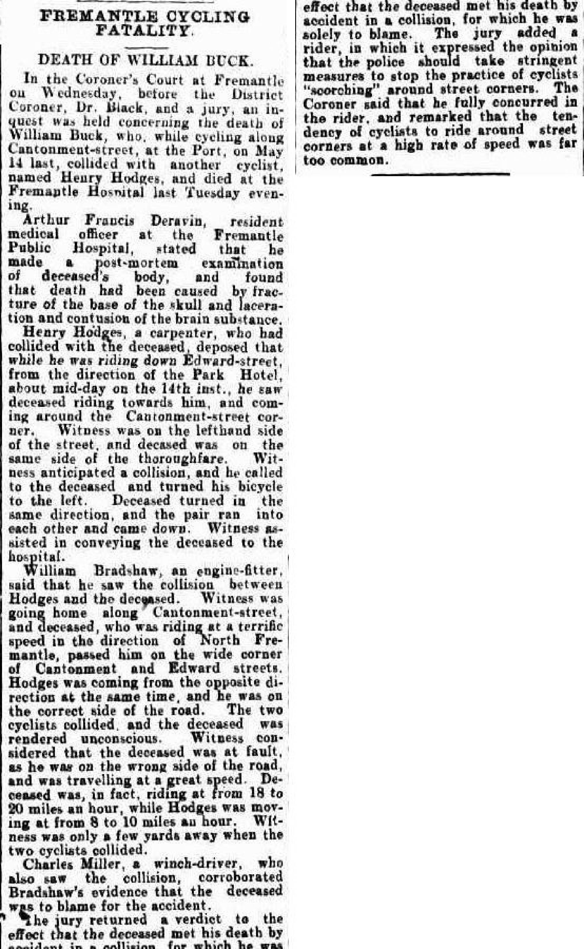 Tragedy struck in May 1901 when William died in a cycling accident in Fremantle. The article below has a full report but he collided head on with another cyclist. The report indicates that William was clearly at fault..
